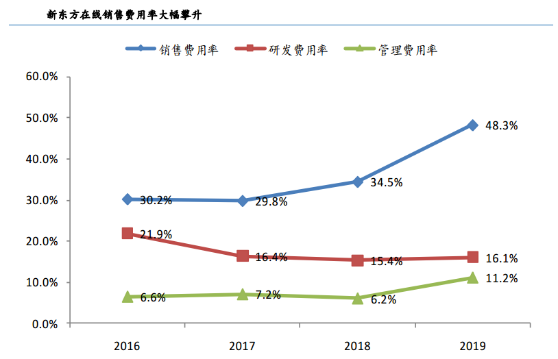 我们在上图可以看到2019财年,新东方在线的销售费用率同比大增 13.8 个百分点至 48.3%。而对比一下好未来,同样呈现出营销费用显著上升的趋势,从2017财年的12.1%增长到2019财年的18.9%。