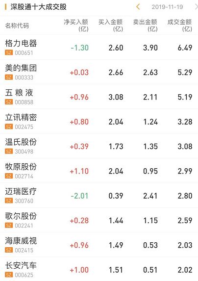 深股通净卖出迈瑞医疗2.01亿、格力电器1.3亿,净买入牧原股份1.1亿。