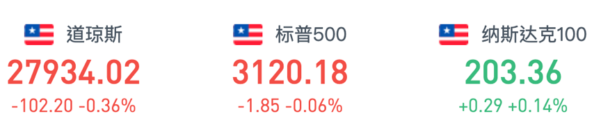 周二,美股三大股指收盘涨跌不一。截至收盘,道指下跌0.36%,报27934.02点;标普500指数下跌0.06%,报3120.18点;纳指上涨0.24%,报8570.66点。