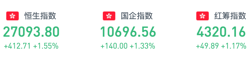 周二,恒生指数开盘微跌0.04%,全天单边上涨,盘中收复二万七关口。截至收盘,恒生指数涨1.55%,报27093.8点,全日成交额达799.06亿。国企指数涨1.33%,报10696.56点,红筹指数涨1.17%,报4320.16点。