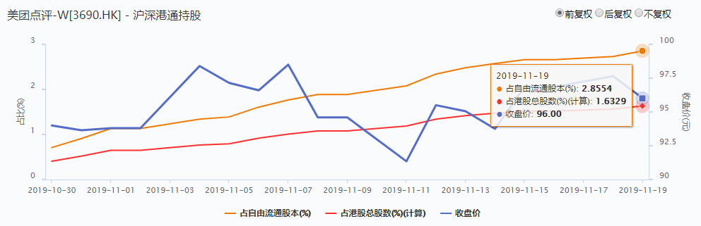纳入港股通以后,美团点评持续获得“北水”买入,3周时间净买入量占总股数的1.63%,总市值近90亿港元。在港股通资金的加持下,美团也向着100港元的历史新高发起冲击。