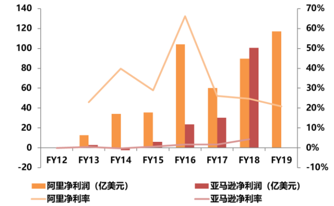 比如在2012财年至2019财年阿里巴巴的利润率保持高位,并且净利润持续高于全球电商巨头亚马逊。但截至11月19日,亚马逊的滚动市盈率是77,而阿里巴巴的滚动市盈率则仅有22.9,估值相差2倍以上。
