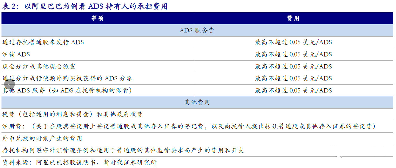 在ADS发行和注销过程中,投资者均需要缴纳手续费,费用最高不超过0.05美元/ADS。 投资者需要担负的其他费用还包括现金或股利分配的手续费、基础证券在托管机构里的保管费等。而对于直接购买阿里港股的投资者而言,就可以省去这部分费用。