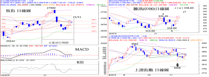 事實上,只要今日能夠守在100天平均線之上收市,則升勢至少可望維持至明日(11月21日),原因是,由11月14日的「綠星日」底部26203開始的升勢,理論上可以維持至下一個「綠星日」為止。未來一個「綠星日」就是11月21日,亦即今次「水星逆行」周期結束的日子,又稱為「水星(停留)順行」(Mercury stationary direct)。換言之,假如恆指在明日創下近日新高的話,就要留意是否有見頂的跡象。