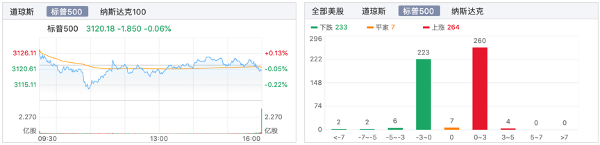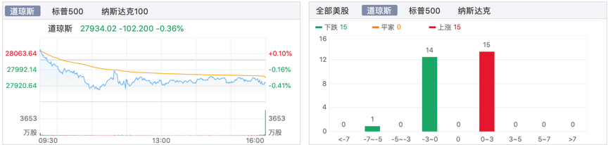 周二,美股三大股指收盘涨跌不一。截至收盘,道指下跌0.36%,报27934.02点;标普500指数下跌0.06%,报3120.18点;纳指上涨0.24%,报8570.66点。