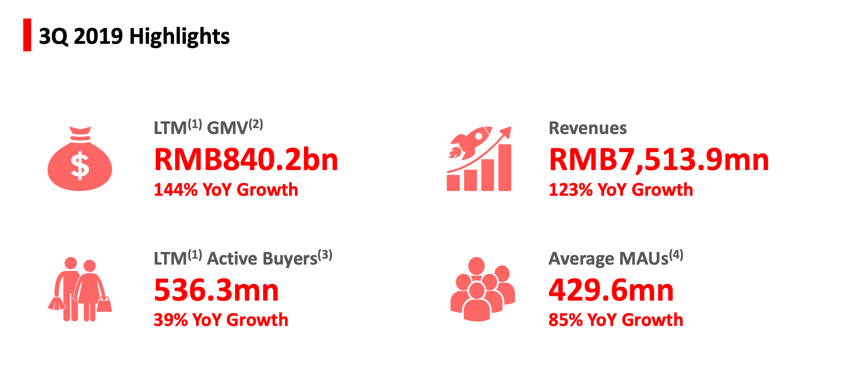 拼多多2019年Q3总营收为75.14亿元,市场预期为74.85亿元,去年同期为33.72亿元,同比大增122%;此外,拼多多Q3平均月活数为4.29亿,同比增长85%。