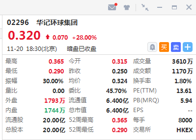 11月20日消息,华记环球集团暗盘收报0.32港元,较发行价涨28%,每手赚560港元,成交额1170万港元,总市值为6.40亿港元。