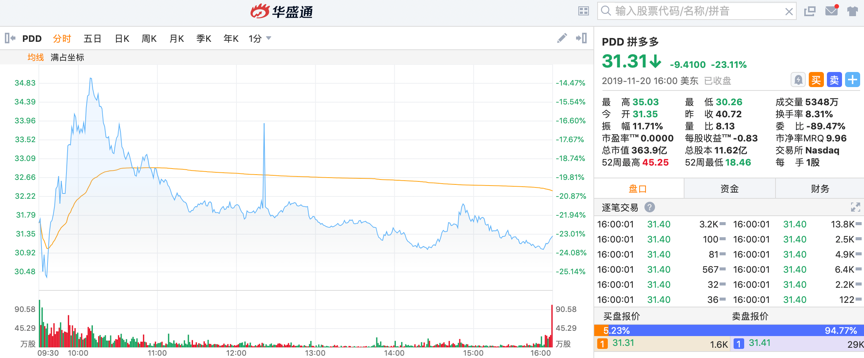 拼多多股价暴跌近23%,创下最大跌幅纪录,收盘报31.4美元,市值缩水至364.9亿美元,被百度、网易等中概股反超。此前,公司发布的Q3业绩公告显示,虽然拼多多的营收和买家活跃数再创新高,但是拼多多第三季度归属股东净亏损达23.35亿元人民币,同比扩大112.7%。