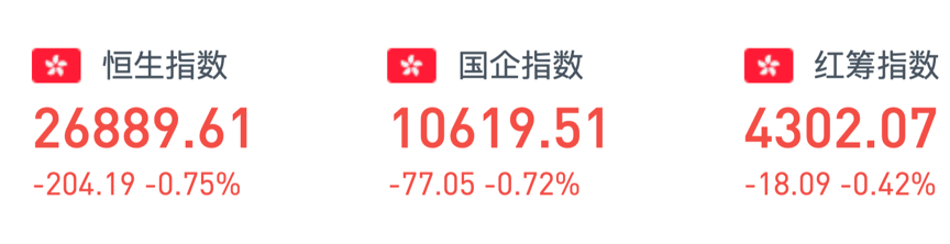 恒指早盘低开157.01点或0.58%,报26936.79点。截至收盘,恒生指数跌204.19点或0.75%,报26889.61点,全日成交额达625.26亿。国企指数跌0.72%,报10619.51点,红筹指数跌0.42%,报4302.07点。