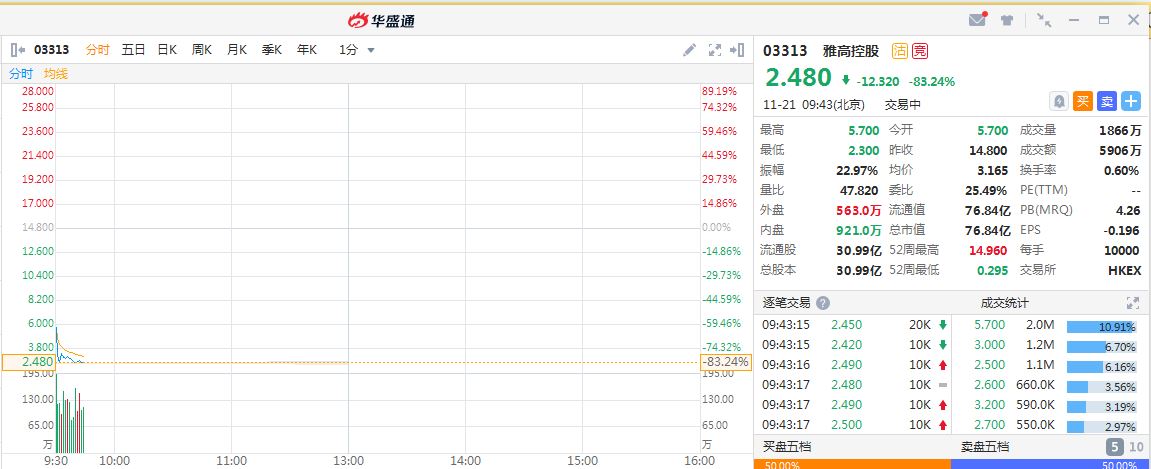 新浪港股讯 11月21日消息,雅高控股遭遇洗仓,股价暴跌83%,报价2.48港元,近400亿市值瞬间蒸发,目前公司总市值不足100亿港元。股价暴跌前雅高控股在11月暴涨172%。