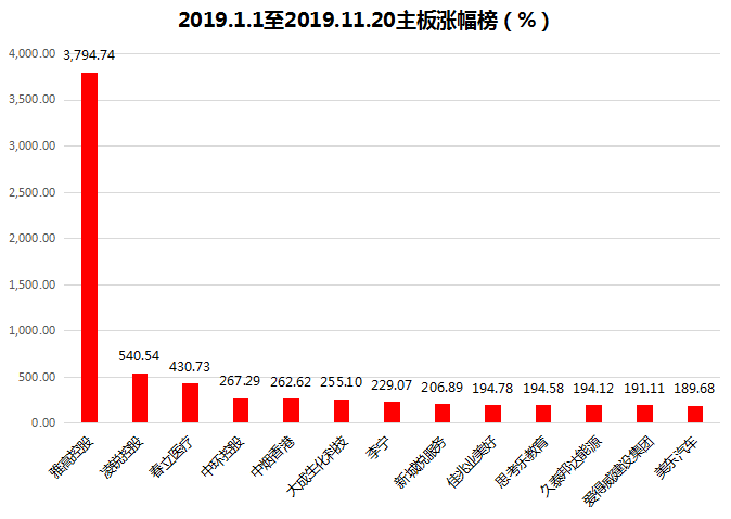 11月中旬已过,要说到目前为止港股整体的表现,那么不禁让人较为失望叹息,从年初至今恒生指数涨幅只有3%左右。但是淡市也可以蕴含巨大投资机会,我们来看看港交所主板股票至2019年11月20日的涨幅排名。