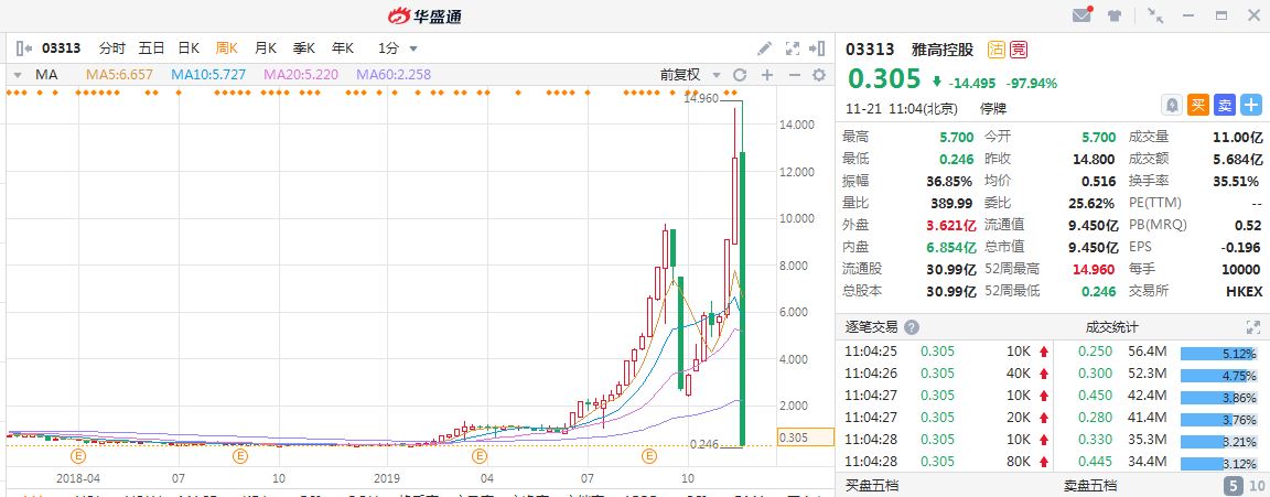但是在11月21日,这只妖股却迎来股价大暴跌,11月20日其收盘股价仍有14.8港元,到11月21日开盘直接低开至5.7港元,并且开始跳水不止。午间宣布停牌,停牌前跌97.94%!也就是说前一天收盘这家公司还有458.7亿港元市值,21日盘中已经最低跌至7.62亿港元市值,市值最大蒸发超过450亿港元!
