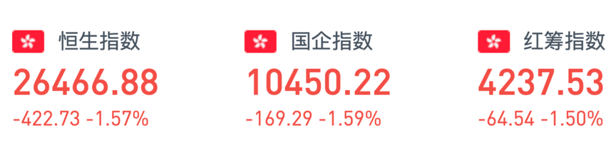 恒生指数开盘低开1.12%,盘初一度急跌超500点,随后跌幅收窄,全天横盘震荡。截至收盘,恒生指数跌1.57%,报26466.88点,全日成交额达754.32亿。国企指数跌1.59%,报10450.22点,红筹指数跌1.5%,报4237.53点。
