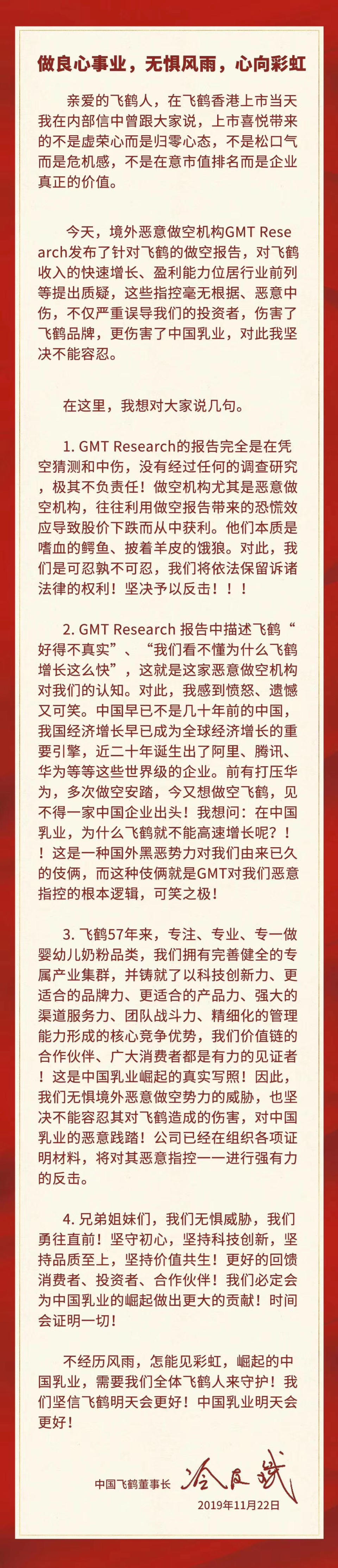 今天,境外恶意做空机构GMT Research发布了针对飞鹤的做空报告,对飞鹤收入的快速增长、盈利能力位居行业前列等提出质疑,这些指控毫无根据、恶意中伤,不仅严重误导我们的投资者,伤害了飞鹤品牌,更伤害了中国乳业,对此我坚决不能容忍。
