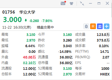 华立大学暗盘低开3.06%,截止16:30,暗盘段报3.00港元,较发行价跌7.9/%,暂成交375万港元,最新总市值36亿港元。