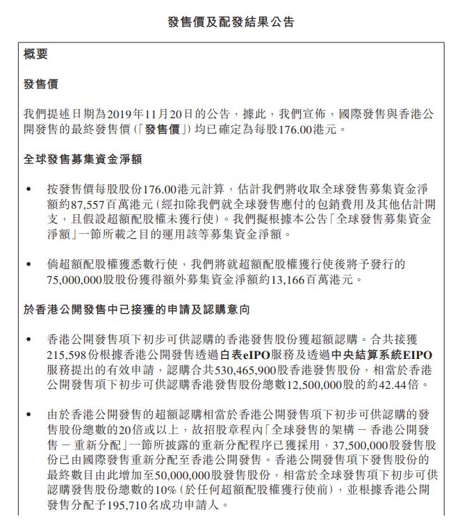 国际发售项下初步提呈发售的发售股份获超额认购。国际发售项下分配予承配人的发售股份最终数目为450,000,000股股份,相当于全球发售项下初步可供认购发售股份总数的90%.