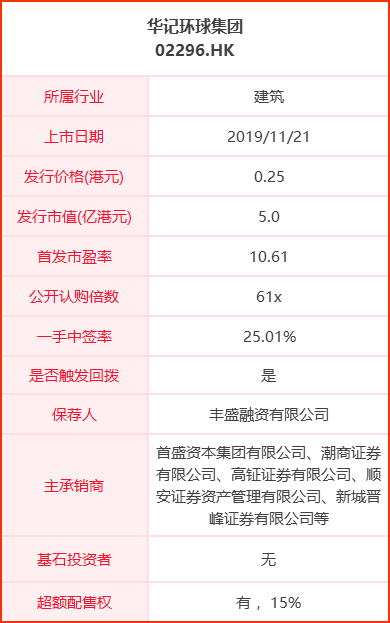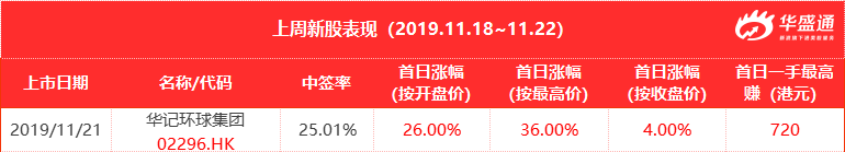 上周唯一的上市新股华记环球集团,中签率25.01%,收盘涨幅4%,最高一度涨36%,一手最高赚720港元。不算大肉,小肉也怡情呀。