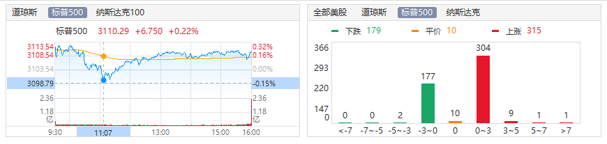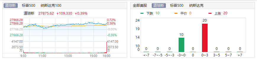 周五,美股小幅上涨,截至收盘,标普500指数涨6.70点,涨幅0.22%,报3110.28点;纳指涨13.70点,涨幅0.16%,报8519.88点;道指涨109.30点,涨幅0.39%,报27875.62点。