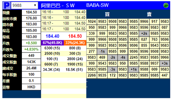 新浪港股讯 11月25日消息,阿里巴巴明日赴港上市,获超购42倍,冻资逾960亿元,逾20万散户参与公开认购,中签率高达80%,买5手稳中1手。今日阿里巴巴暗盘最终收涨4.94%,报184.7港元。根据公告,阿里巴巴的最终发售价已确定为每股176港元,将于11月26日在香港交易所主板上市交易,股票代码为09988。