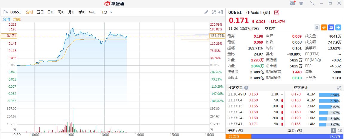 新浪港股讯 11月26日消息,中海重工放量大涨150%,报价0.17港元。