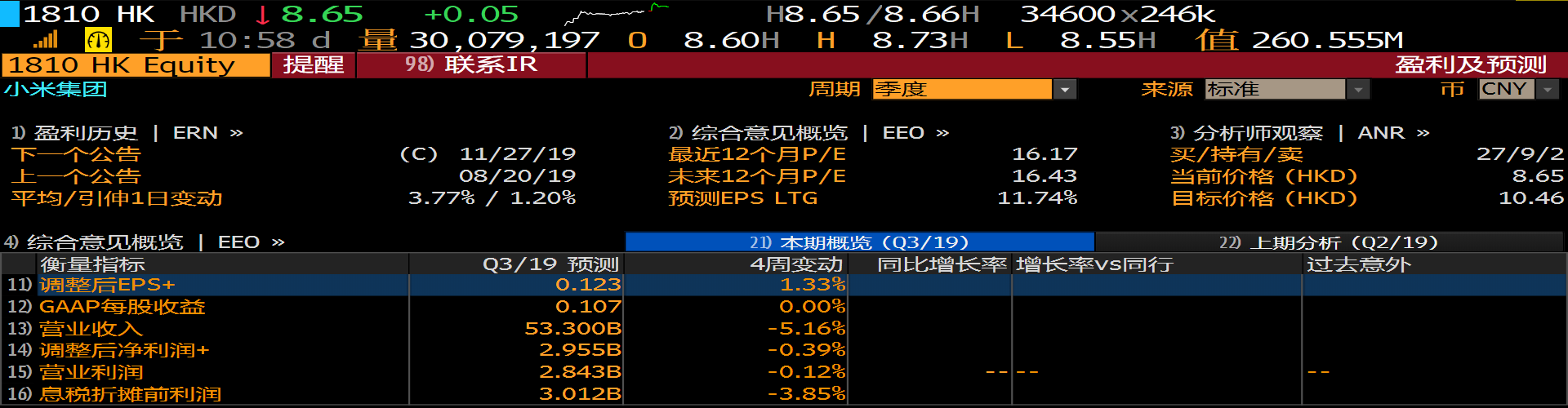 彭博上的各大投行分析师对于11月27日小米将发的三季度财报做出预测,预测其Q3营收为543.68亿元人民币,近四周的预测下调了5.16%;调整后的EPS为0.123元每股,调整后净利润为29.54亿元,营业利润为28.4亿元。