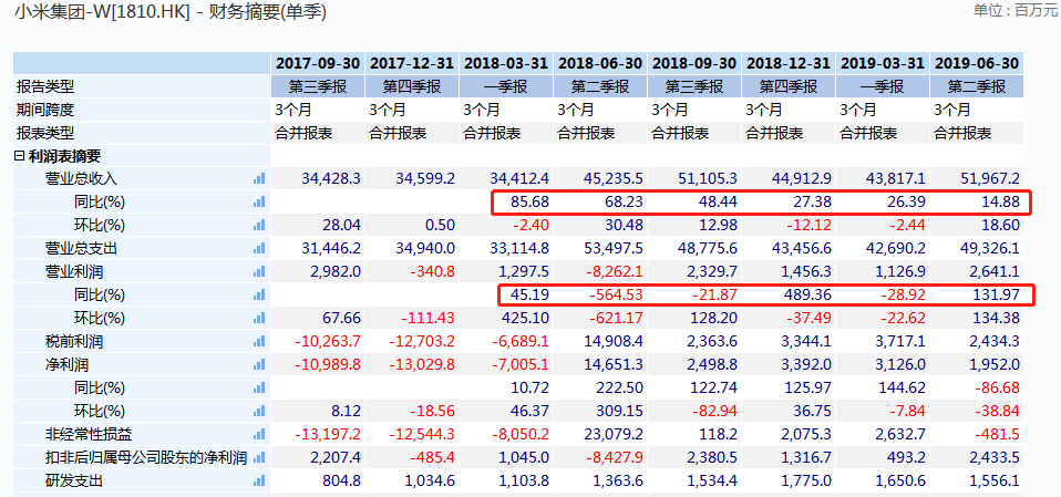 和2018年同期的三季度财务数据比较,不管是从营收还是营业利润的预测来看,小米同比增长速度都将有一个大幅下滑。说明大部分的券商对于此次小米的三季度业绩都有了较为看淡的预期。