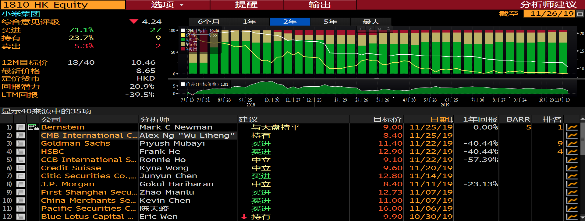 而从近3个月对于小米有过投资评级的18家券商来看,给与小米未来12个月的平均目标价为10.46港元,虽然要比当前截止11月25日收盘股价8.6港元更高,但显然距离发行价17港元还有很大距离,更加难实现雷军上市时说的在发行价基础上再翻一倍收益。