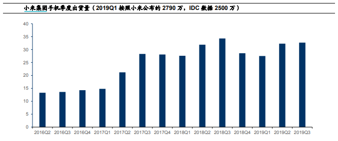 小米2019年三季度全球手机出货量则同比下降3%至3270万。同时小米在印度市场的出货量保持健康,三季度同比增长9%,市场份额为27.1%。