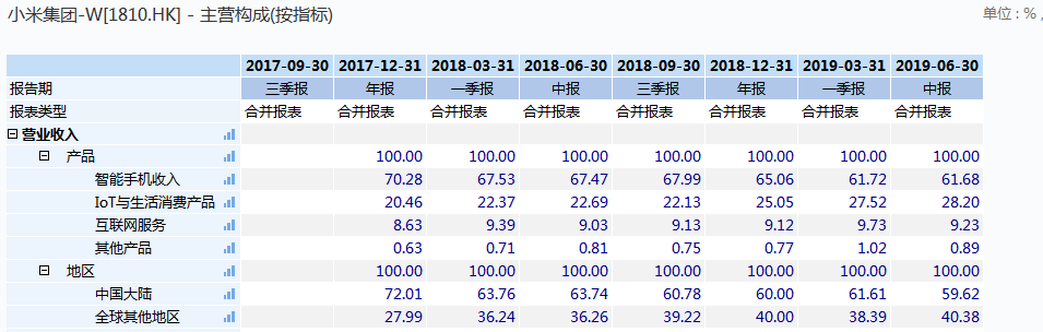 小米的IOT(物联网)产品业务一直保持着强劲的增长速度,在2019年一、二季度分别保持了同比增长56%和49.31%。业务收入占比也在2019年Q2成长到了历史最高的28%。