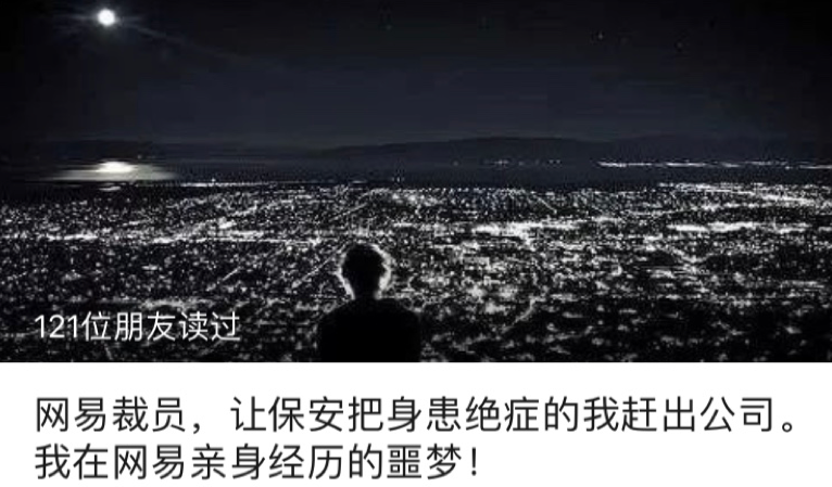 2019年11月23日深夜,一篇题为《网易裁员,让保安把身患绝症的我赶出公司》的公众号推文引起社会各界的强烈反响。文章的作者自称为网易前员工,他以亲身经历向社会公众反映了其在网易经历的“逼迫、算计、监视、陷害、威胁和暴力裁员手段”。