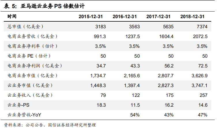 阿里巴巴的云业务以亚马逊 AWS 作为阿里云的估值对标对象,亚马逊AWS在2015-2018年的 PS(市销率)倍数介于 11-19 倍之间。考虑到亚马逊AWS 市占率高于阿里云,规模效应更显著,且已经实现了盈利,给予阿里云一定的估值折价,给予其 2020 年 PS 为 6-7 倍,对应市值为 545-636 亿美金。