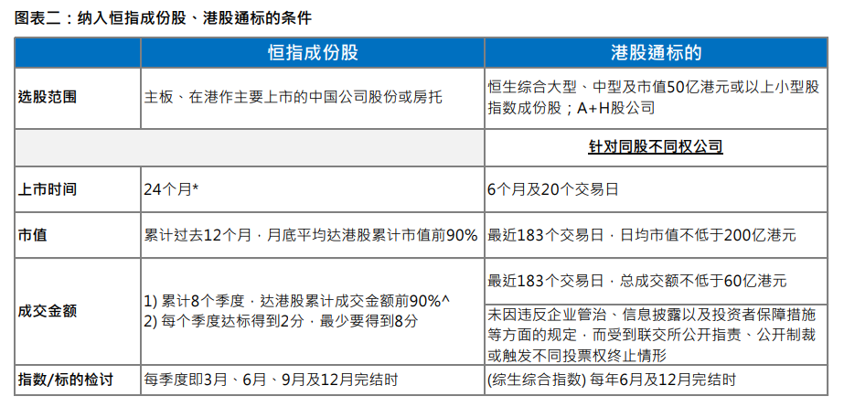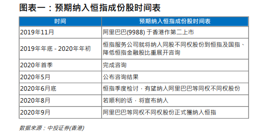 要进入港股通,还要符合上交所及深交所的要求。两个交易所都容许同股不同权股份成 为港股通标的,但要求公司符合以下条件:1) 须在香港上市满 6个月及 20个港股交易日;2) 在考察日前183日的港股交易日的日均市值不低于200亿元、总成交额不低于 60 亿元;3) 上市以来股票发行人和不同投票权受益人未违反联交所规定。阿里巴巴将于11月26日上市,要上市 183 个交易日才能满足市值及成交金额的要求,最快需要明年第 3 季度才有望进入港股通。总而言之,不论恒指还是港股通,都要明年第3季度才有望陆续加入。