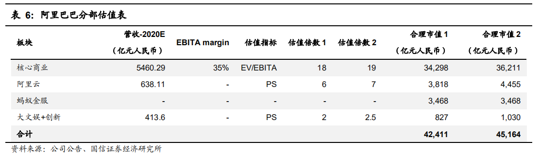 在电商业务中,国内投资机构预计阿里巴巴 2019-2021 年核心电商的营收复合增速是 23%,EBITA增速为 16%,投资机构给予该业务 18-20 倍 EV/EBITA,2020 年该部分业务对应市值为 4896-5169 亿美金。