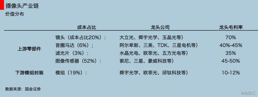 2. 中游的镜头市场有一定的技术壁垒,毛利最高可达70%,有时比做传感器还赚钱。市场规模差不多是40-50亿美金,比图像传感器小了许多。