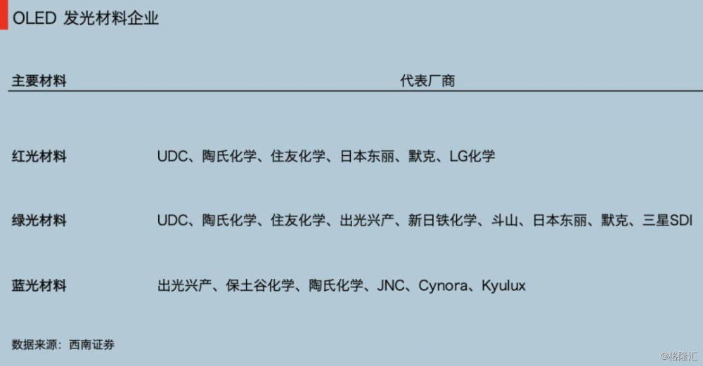 1.上游是材料和设备,平均毛利率50%往上走,主要有玻璃基板、发光材料、蒸镀机等核心材料和设备。
