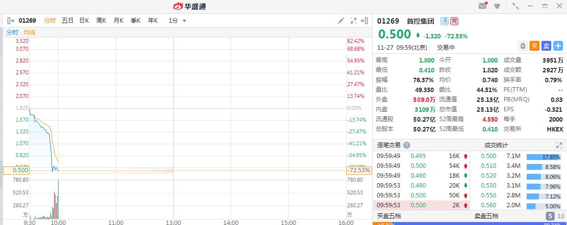 港股首控集团盘中跳水,跌幅一度扩大至75%,市值缩水超60亿港元,公司为港股通标的。