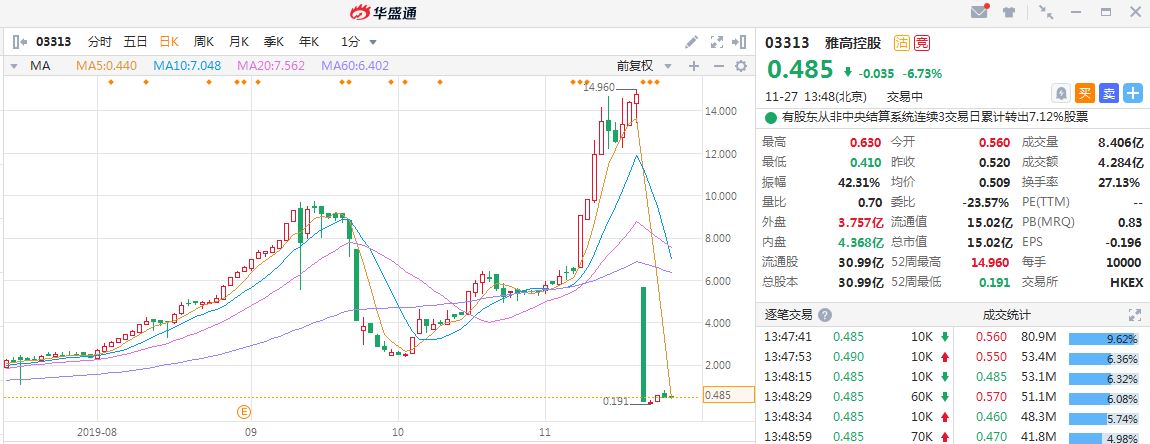 同样,11月8日收盘后,雅高控股宣布被MSCI调整纳入,只暴跌前的11月,雅高控股就暴涨了172%,最高报14.96港元。而在雅高被剔除MSCI指数后,股价一地鸡毛,暴跌98%。对于雅高控股的分析,此前我们已做过分析<暴跌个股走势为何分化?雅高控股庄家意欲沽给MSCI,卡森澄清成色几何?>