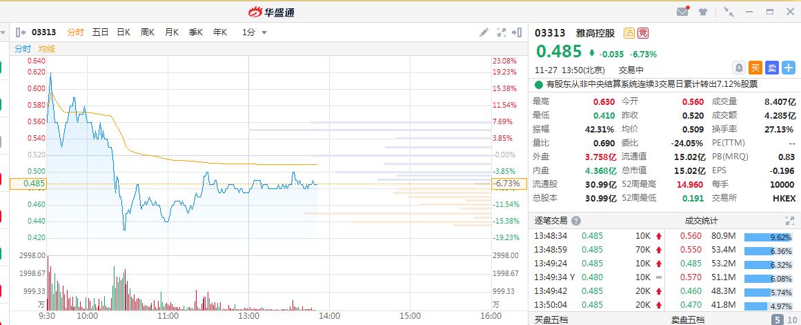 很快,10点10分左右,此前遭遇500亿市值大蒸发的38倍牛股雅高控股再暴跌98%以后,再度迎来跳水,一度跌18%,目前市值只有14亿港元。