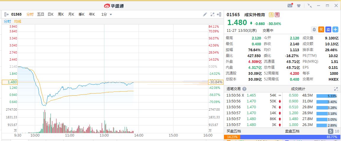 紧随其后,9点50分左右,成实外教育也开始闪崩,股价最深跌78%,最低见0.48港元,而股票又瞬间拉高至1港元以上,目前报1.4港元,市值蒸发23亿港元。
