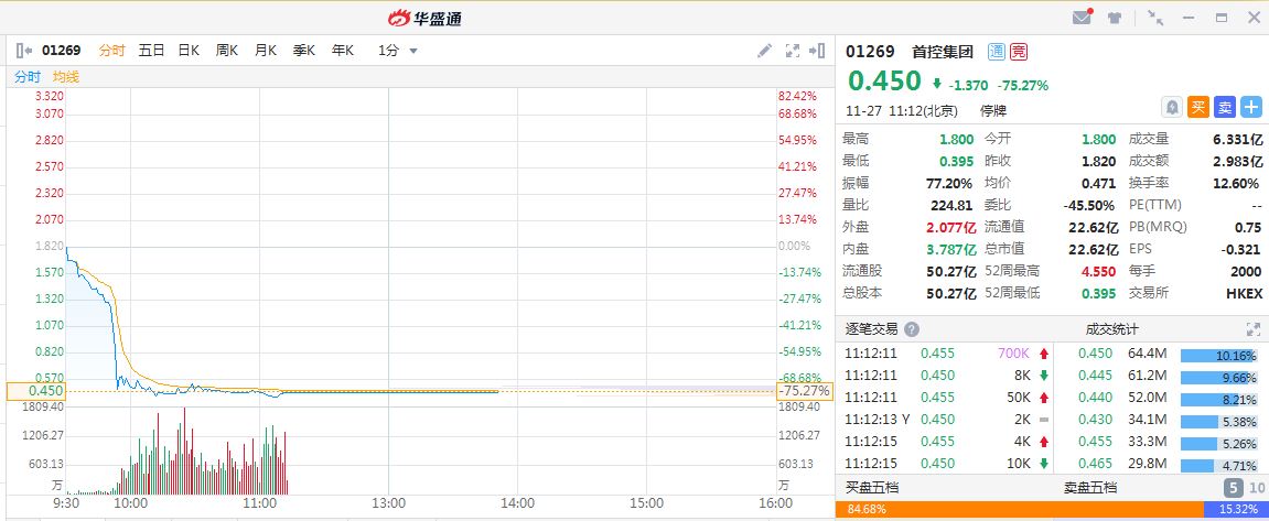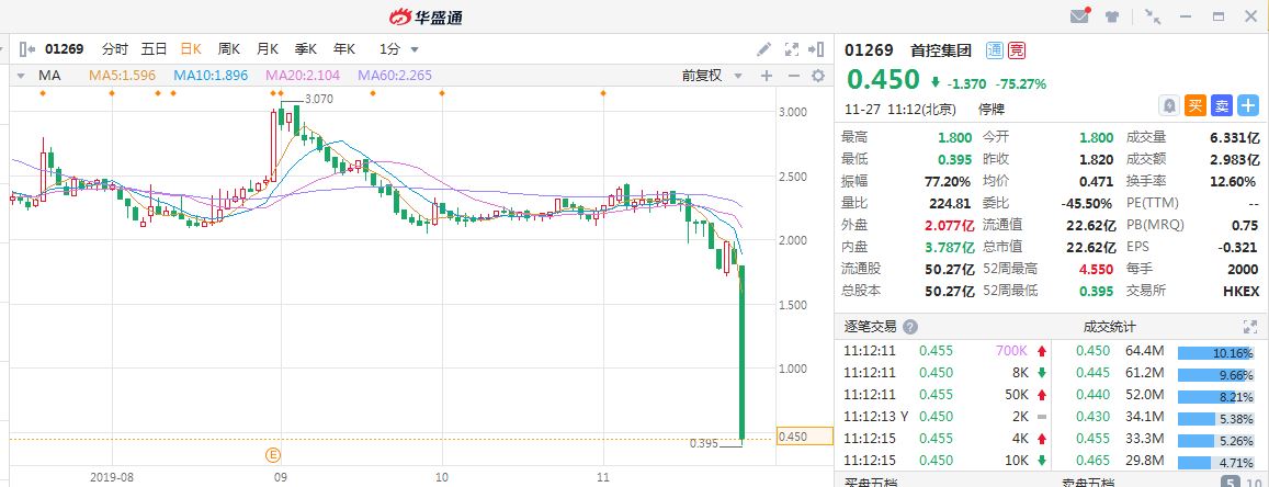 首控集团今日开盘后越走越低,在大约9:47分开始,首控集团遭遇洗仓,股价暴跌78%,最低见0.395港元,瞬间沦为仙股,70亿市值蒸发,此后临时停牌,停牌前跌75%,日前首控集团只有23亿的市值。