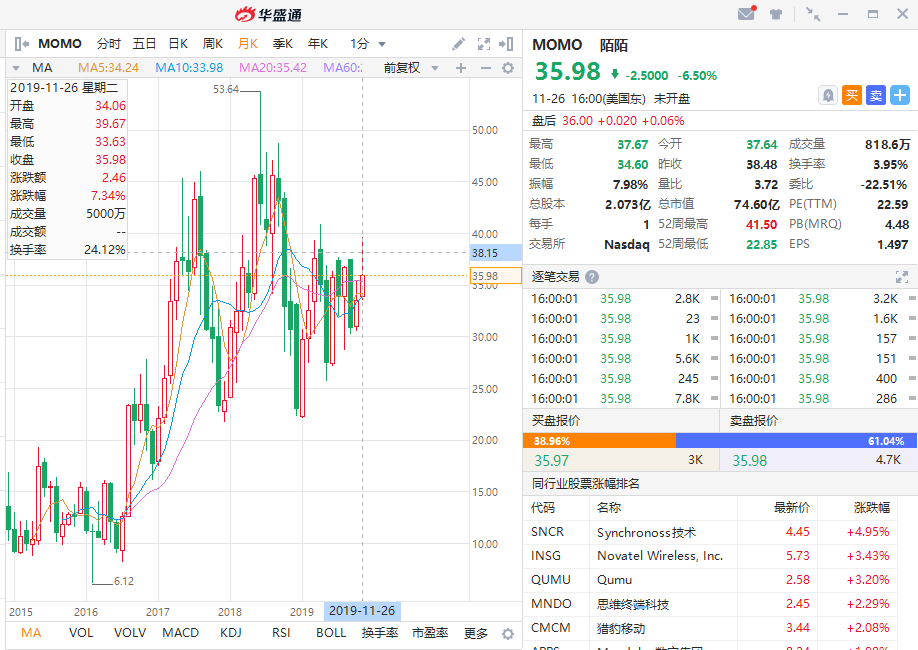 “2019年第三季度又是业绩表现强劲的一个季度。”陌陌公司董事长兼CEO唐岩表示:“我们的收入和利润再次取得了很好的成绩,此外,我们在产品创新和培育未来增长点上也有稳步进展。”但市场并不这样认为,受财报影响,陌陌盘后报35.98美元/股,跌幅6.5%,总市值74.7亿美元。