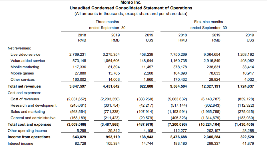 11月26日,陌陌公司公布了其2019年第三季度 (Q3) 财报。几年前,投资者听到陌陌,都会大意的认为陌陌会像无数个交友App一样,随着时间消失在眼球中。但陌陌并没有消失,反而让自己的净利润和业务插上了翅膀,自2015年到美国上市,股价涨幅超过3倍。这次三季报能告诉我们关于什么陌陌的信息,陌陌到投资的时候了吗?陌陌的未来又会如何呢?我们一起探寻。
