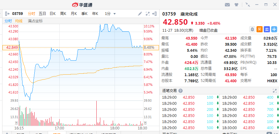 康龙化成暗盘收报42.85港元,较发行价涨8.48%,每手赚335港元,成交额3.51亿港元,总市值为332.9亿港元。