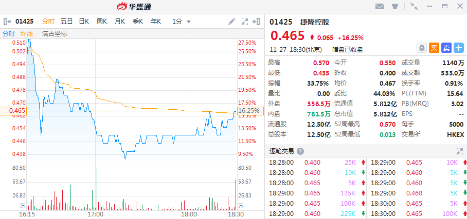 捷隆控股暗盘收报0.465港元,较发行价涨16.25%,每手赚325港元,成交额533万港元,总市值为5.812亿港元。