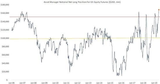 卡尔瓦西纳称,数据显示,资产管理者已通过期货市场将美股的敞口推高至略高于其在2019年7月、2018年9月、2018年1月和2007年高点的位置。所有这些日期都是美股的“主要”高点。这是令她保持谨慎的主要原因。