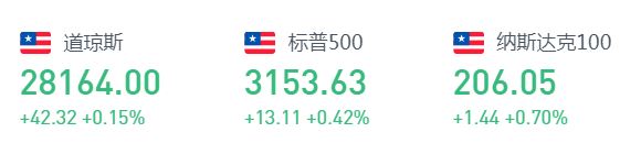 美股周三小幅收高,三大股指再创盘中与收盘历史最高纪录。道指收盘上涨42.32点,或0.15%,报28164.00点;标普500指数涨13.11点,或0.42%,报3153.63点。