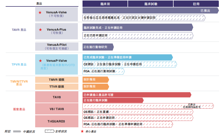 全面的产品组合,巩固了领先地位并满足了未获满足的医疗需求。已开发全面的产品组合满足经导管心脏瓣膜置换术的未获满足医疗需求。产品组合涵盖全部四个心脏瓣膜(即主动脉、肺动脉、二尖瓣及三尖瓣)的经导管手术及包括TAVR产品(VenusA-Valve)、TAVR在研产品(VenusA-Plus及VenusA-Pilot)、TPVR在研产品(VenusP-Valve)及二尖瓣及三尖瓣在研产品。除核心心脏瓣膜产品外,亦为瓣膜置换解决方案提供主要配套产品,包括瓣膜成形术球囊(V8╱TAV8)及CEP装置(TriGUARD3),以为经导管心脏瓣膜置换术实现全面的产品供应。