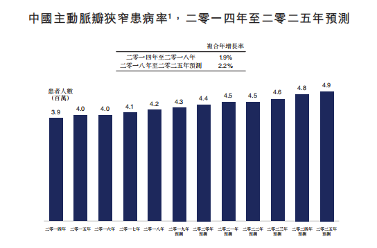 中国主动脉瓣狭窄患者人数由二零一四年的3.9百万人增加至二零一八年的4.2百万人,且预期于二零二五年将增加至4.9百万人。该增加主要是由于风湿性瓣膜性心脏病的患病率上升所致。下图显示中国主动脉瓣狭窄患病率。