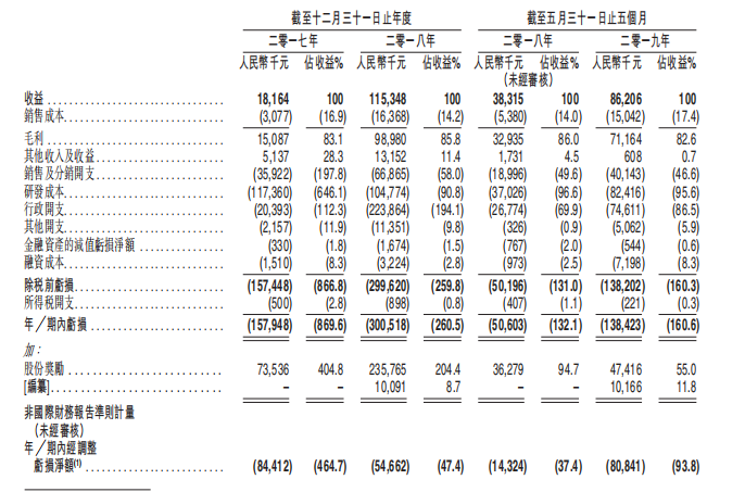 2017年-2018年两个财政年度,收益分别为人民币1816.4万元及1.15亿元,亏损分别为约人民币1.58亿元及3亿元。于2019年前5个月收益为8620.6万元,亏损约1.38亿元。