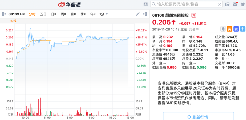 华盛证券11月28日讯,麒麟集团控股(08109)盘中大涨,涨幅一度超50%。截至发稿,麒麟集团控股涨38.51%,现报0.205港元每股,成交量达3264万,成交额达650.4万港元,换手率为14.72%。